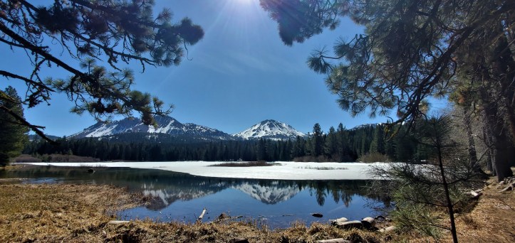 April 9 – 11: Lassen Volcanic National Park – We spent the a few nights in Shingletown, CA and connected with another college buddy, Rudy Van Pelt. They have a family cabin just outside of Lassen’s northern entrance, where Rudy and his brother in-law entertained us with an amazing dinner and lots of info of the area. Rudy also showed us around what we could see from the north entrance, but the road across the park to the southern side was still closed due to snow. We wandered around Manzanita Lake and took in outstanding views of Lassen Peak. Lassen’s claim to fame is the fact that there are 4 different types of volcanoes in a very close area: Mount Harkness, a shield volcano, Cinder Cone, a cinder cone, Lassen Peak, a plug dome and Brokeoff Mountain, a composite volcano.