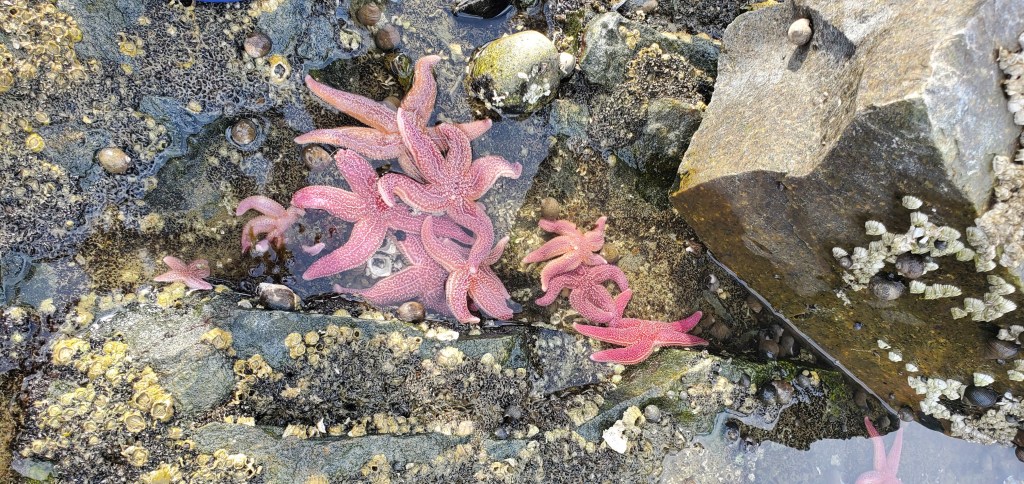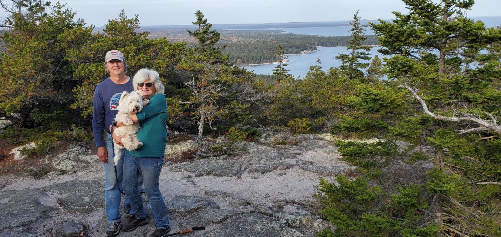 October 12 – 13: We spent 2 days with Cindy Mueller and Rick Kron touring our local area. We drove a little north of us to the blueberry barrens in their fall glory, 6” – 12” shrubs that all of the wild Maine blueberries come from. We also made a visit to Tidal Falls in nearby Hancock and the pink star fish…I guess they are now called sea stars as they technically aren’t fish. On a side note, these pink star fish from Tidal Falls were the inspiration for Sponge Bob Square Pants’ character, Patrick! Of course, a trip up to Schoodic Head with Rick and Cindy’s faithful companion, Watson, capped off the trip with views Down East as well as Mt. Desert Island.