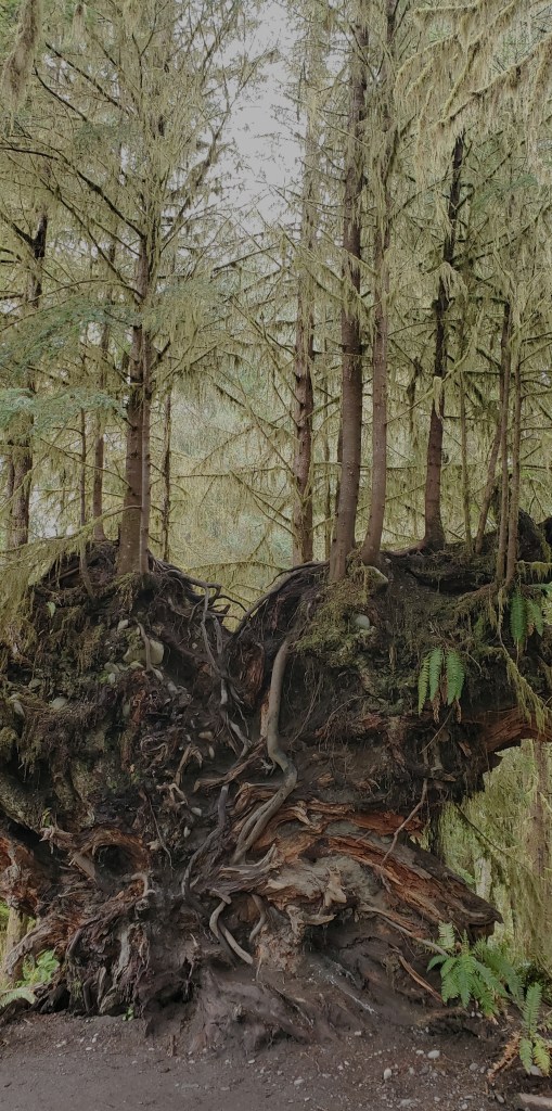 Uprooted giant Doug Fir with smaller trees growing from the trunk and roots