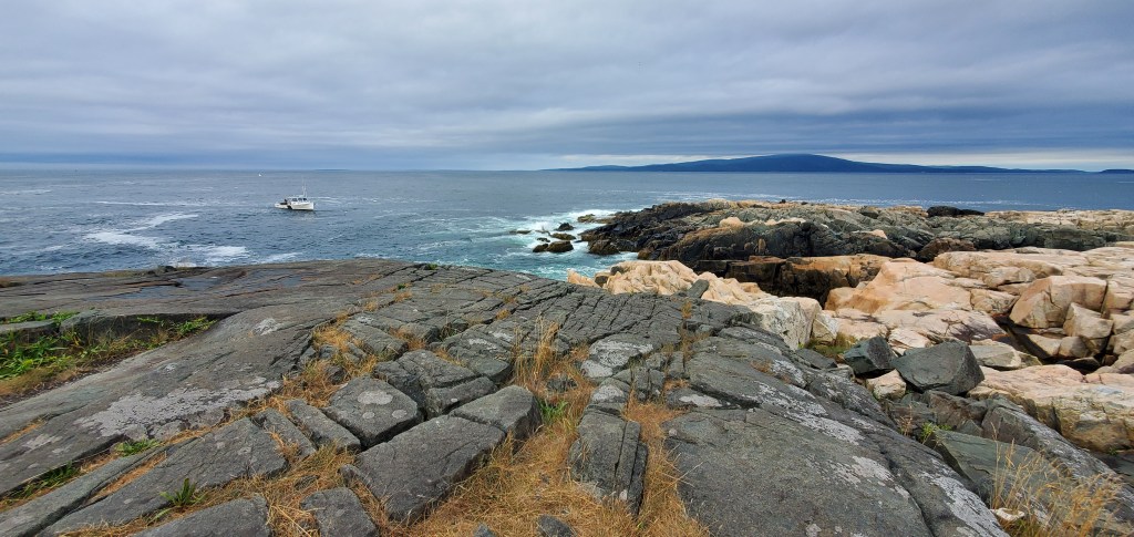 Sun Dew Trail view with lobster boat and Mount Desert Island in the background