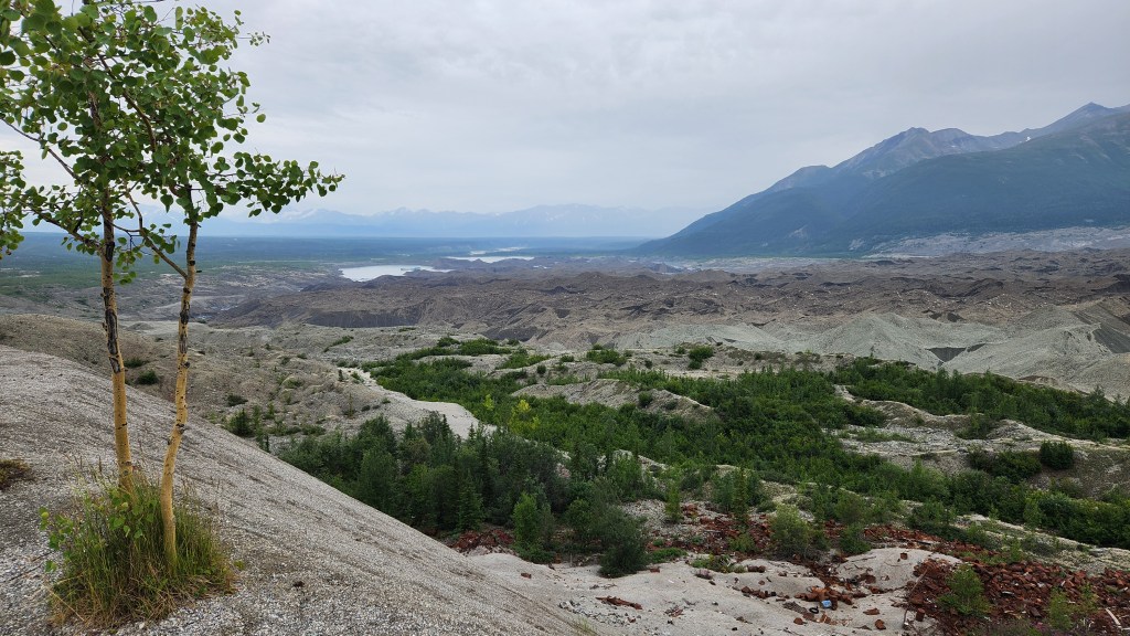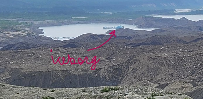 Kennicott Glacier is under all that rock debries. The lake/ponds you see on the left are recent from a few days ago that developed when a natural plug in Hidden Lake dam broke and the water all flowed down under the Kennicott glacier and created the lake. There’s actually an iceburg in the the closest lake that wasn’t there 2 days ago.