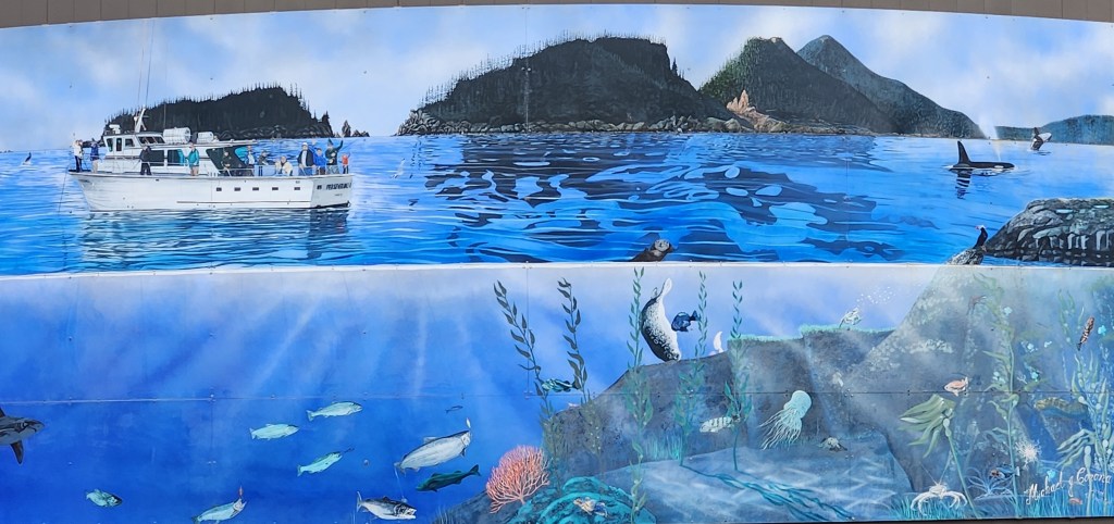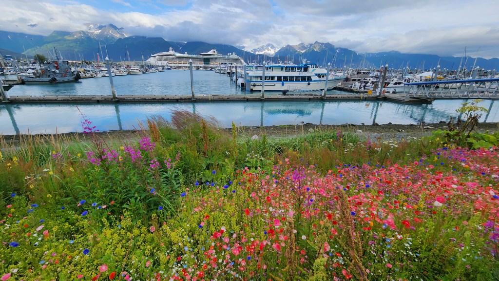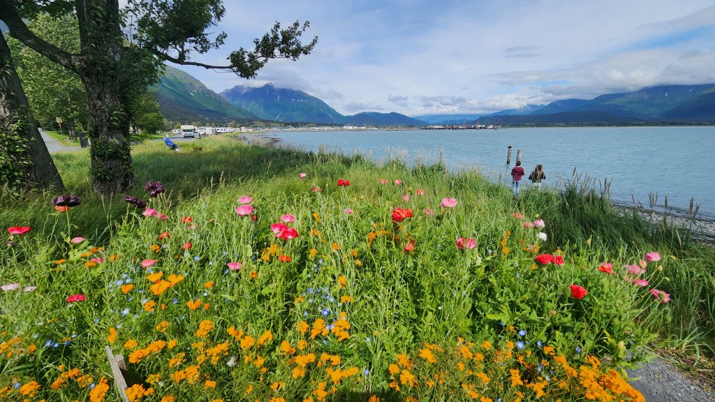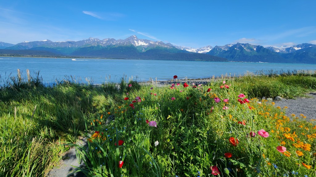 Seward, located on Resurrection Bay, is another small harbor town greatly affected by the 1964 earthquake. The harbor was originally a little further south, but was destroyed in the 1964 earthquake and the area deemed not stable enough to rebuild the harbor. So they built the mile-long Waterfront Park & Campground filled with little mini gardens of wildflowers. The town also is decorated with local artist’s murals throughout.